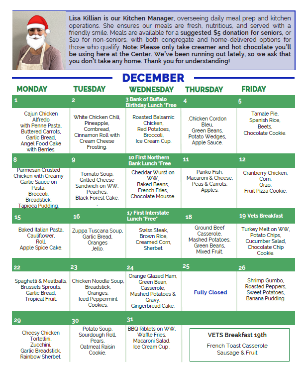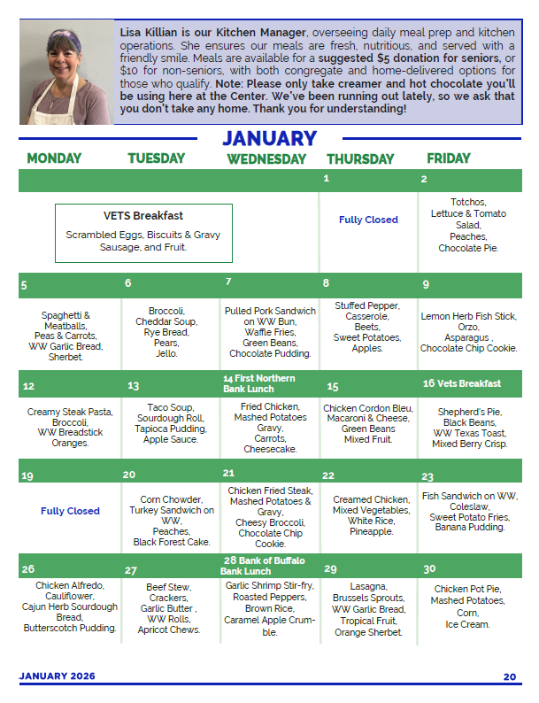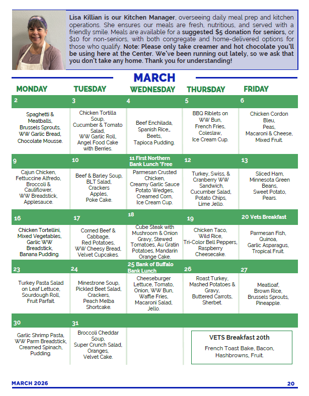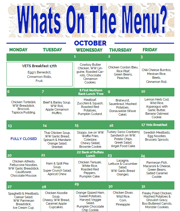 2nd Wednesday lunch is sponsored by First Northern Bank and the Last Wednesday of each month is the Birthday Lunch. Those with birthdays that month have their lunch sponsored by Bank of Buffalo. Quarterly, First Interstate Bank sponsors a lunch. Please call the center if you would like the dates.
